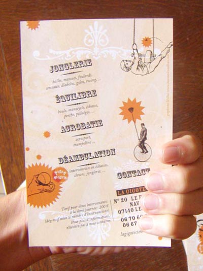 plaquette, tract, & carte de visite pour les ateliers d’initiation aux arts du cirque de la compagnie La Gigote.