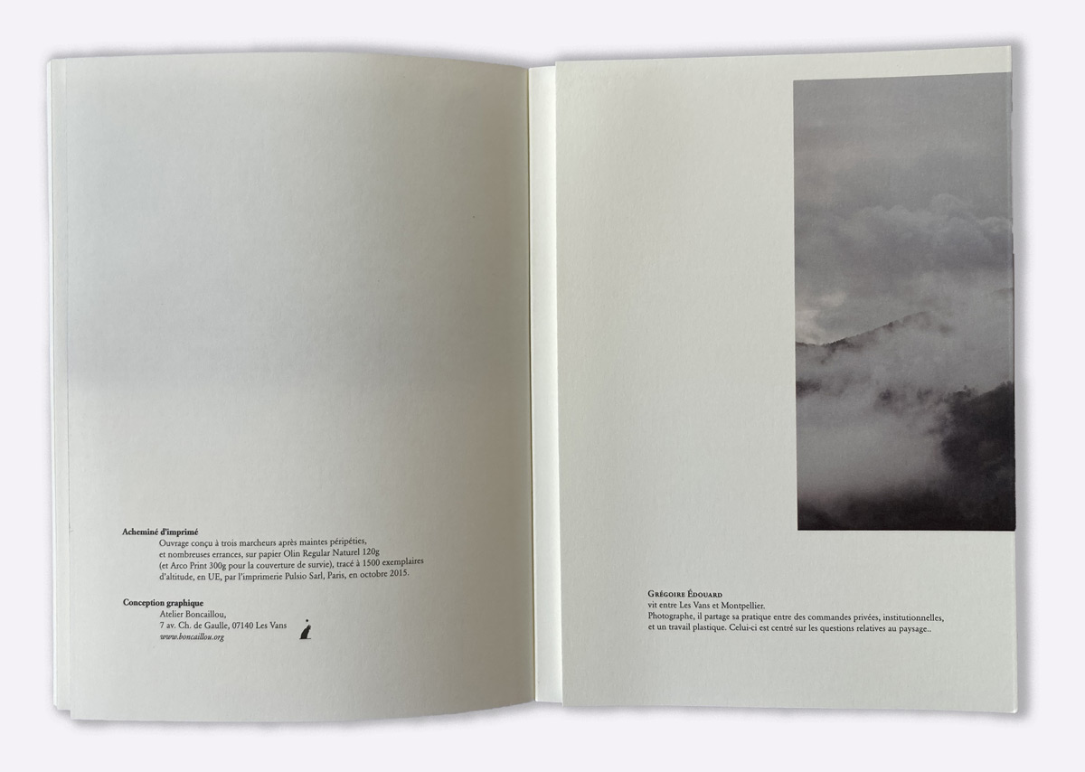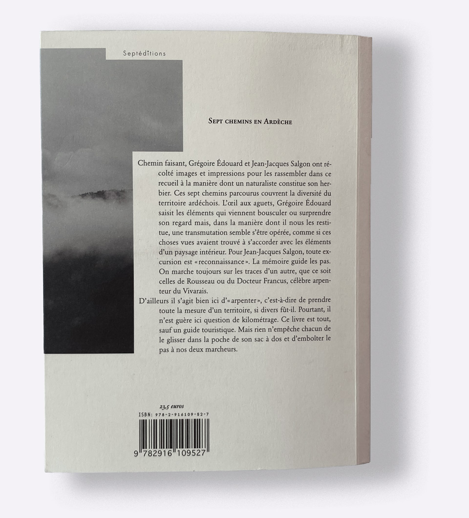 Chemin faisant, Grégoire Édouard et Jean-Jacques Salgon ont récolté images et impressions pour les rassembler dans ce recueil à la manière dont un naturaliste constitue son herbier. Ces sept chemins parcourus couvrent la diversité du territoire ardéchois.
