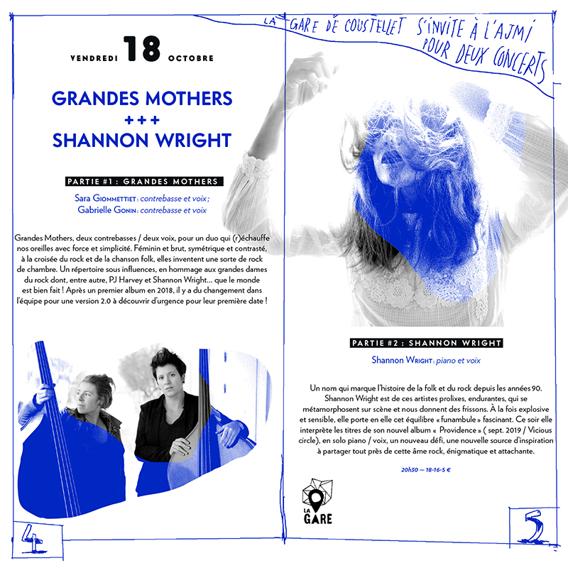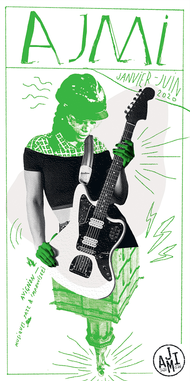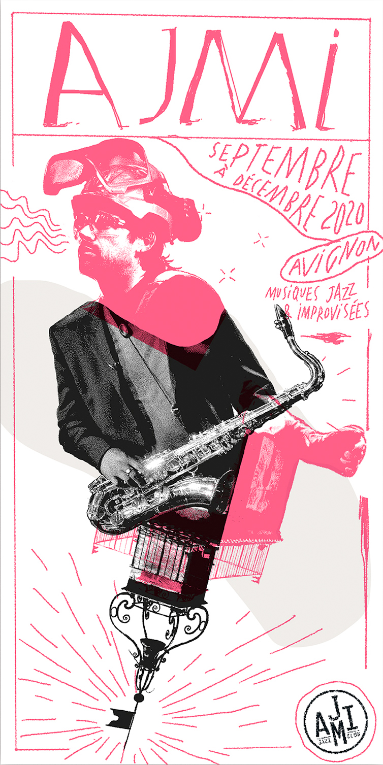 Reprise de l’identité graphique de l’Ajmi, scène labélisée SMAC autour des musiques jazz et improvisées. Avec la volonté de casser un peu les codes du monde élitiste du Jazz, remettre en avant un public de toutes classes sociales, du contemporain et du classique, le tout dans la cité des papes.