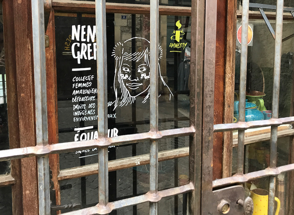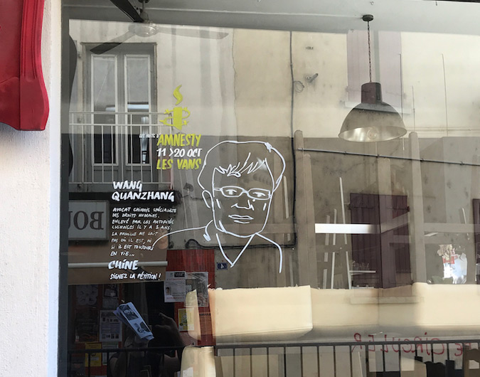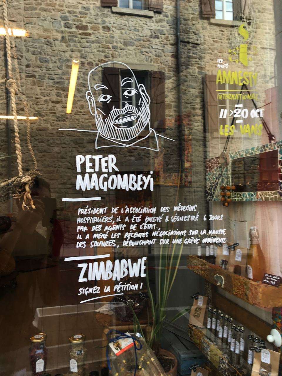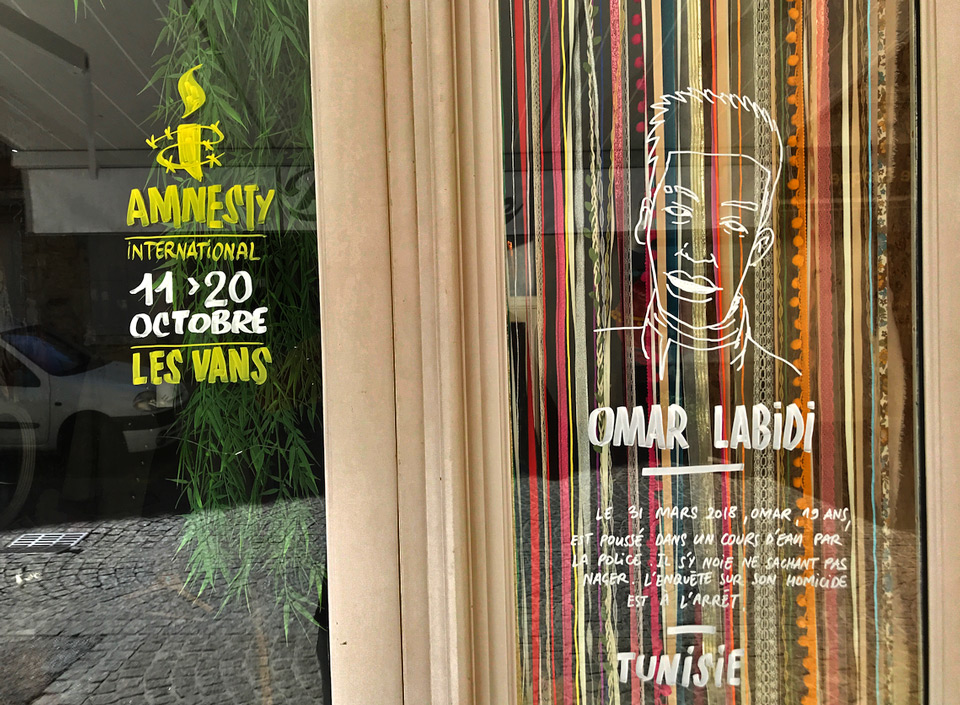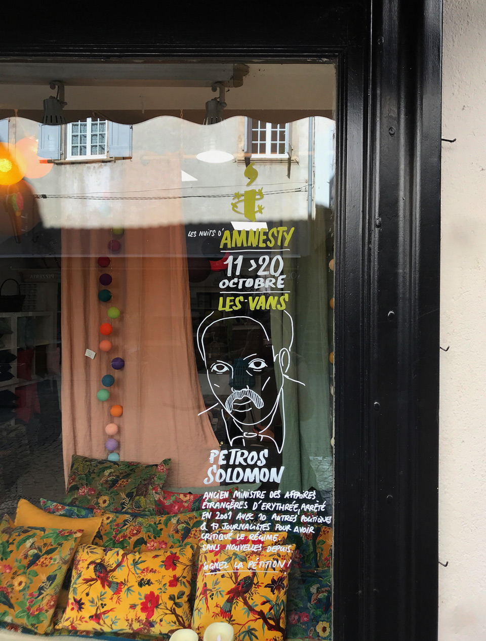 Communication dans la rue pour les nuits d’Amnesty International, sur les vitrines de commerces vanséens. portraits des activistes emprisonnés et soutenues par Amnesty pendant l’évènement.