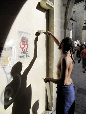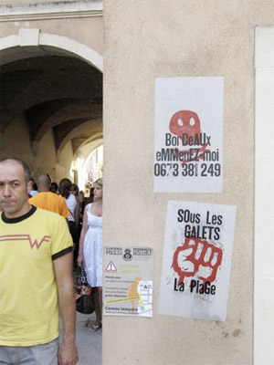 Du bois, un vieux landau (dans lequel j’ai trainé mes guêtres), un poto charpentier parfais comme complice pirate (Jojo), un copaing aux pinceaux (Sylvain Marc) pour la peinture de façade, des typo bois, une gravure en hommage à 68 (merci Marielle) et hop, on se retrouve avec Jojo à Châlon Sur Saône pour le festival de théâtre de rue de Châlon dans la rue.