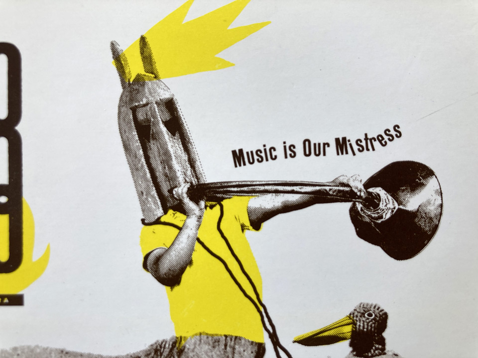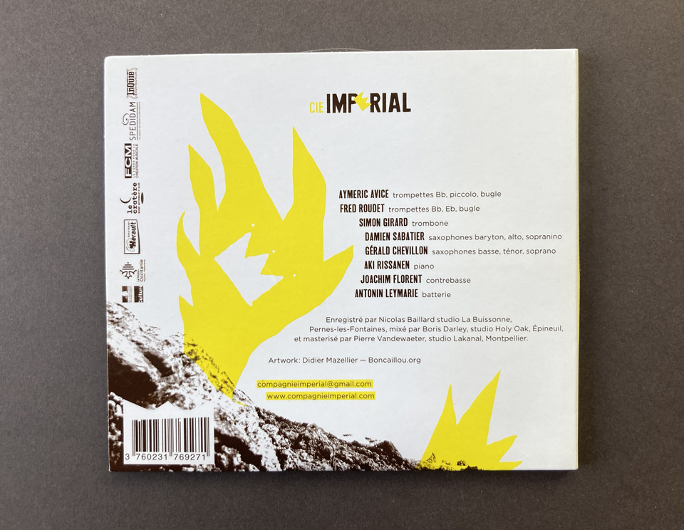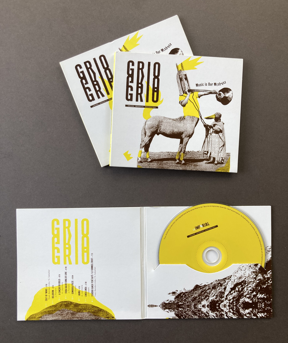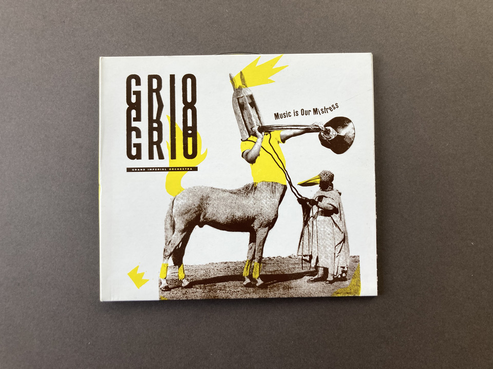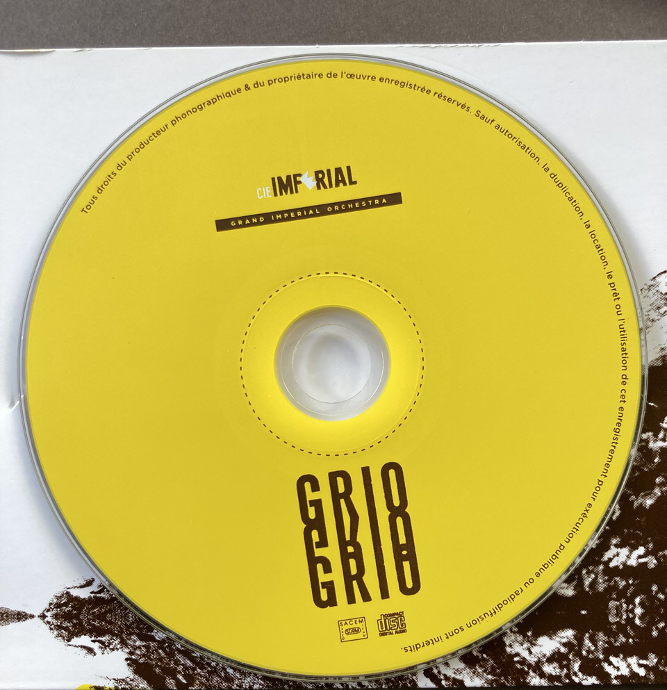 « Un centaure casqué jouant d’un casque cabossé, dont la bride est tenue par un individu à tête d’oiseau. Le nom ?ce n’est pas beaucoup plus clair. On lit Grio à l’endroit et à l’envers. Grand Impérial Orchestra, et aussi Compagnie Impérial, autant de renvois à une royauté bricolée ou à une suprématie ludique semblable à celles qu’affectaient les orchestres africains des années 1960 à 1980. »
