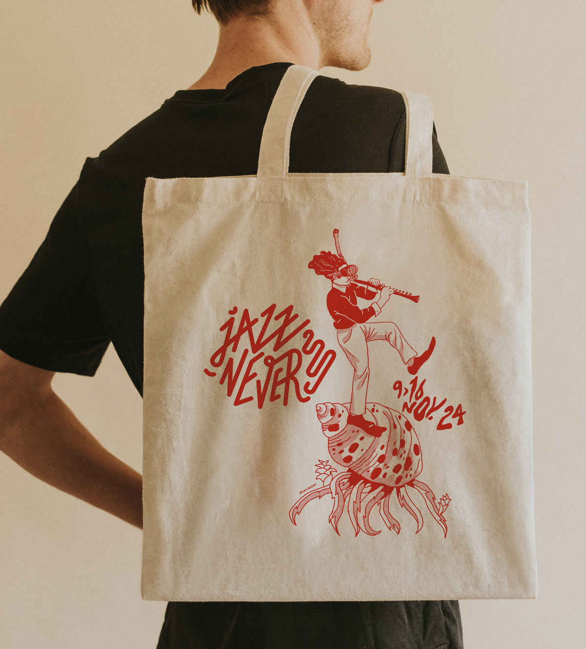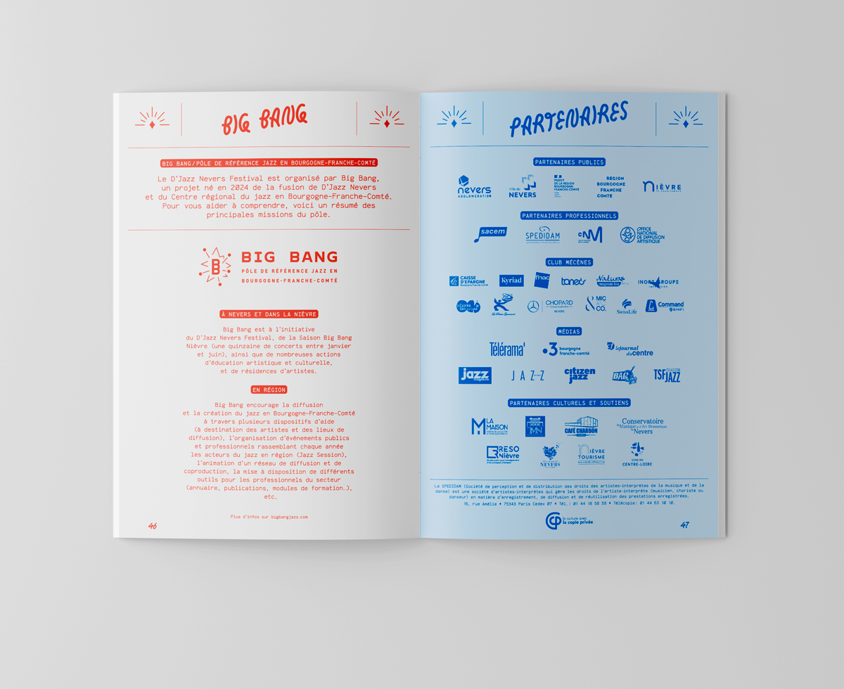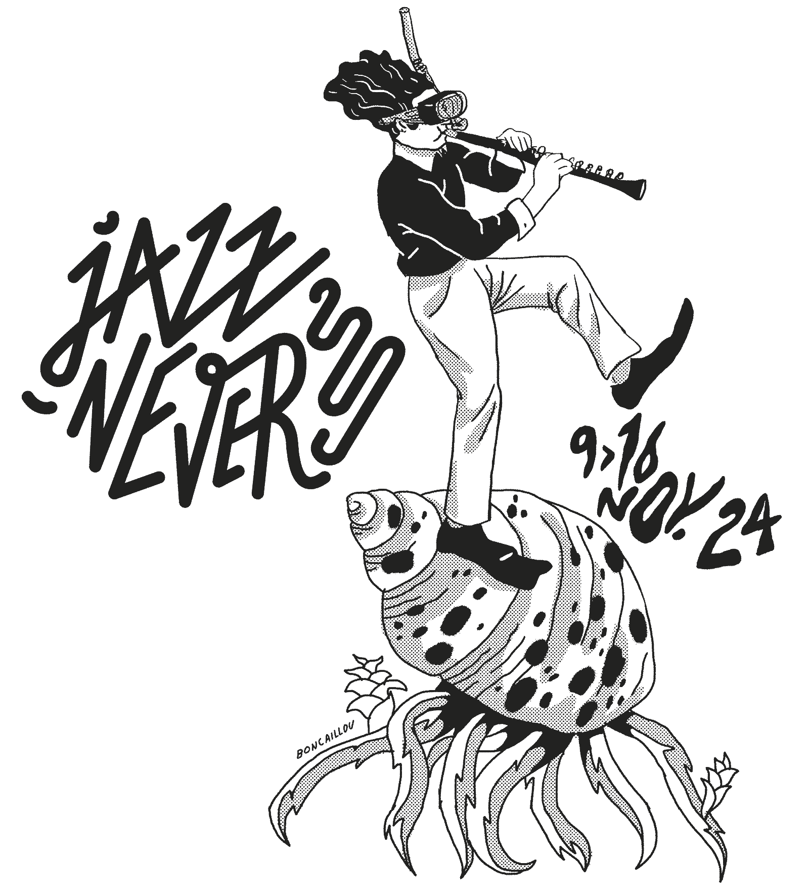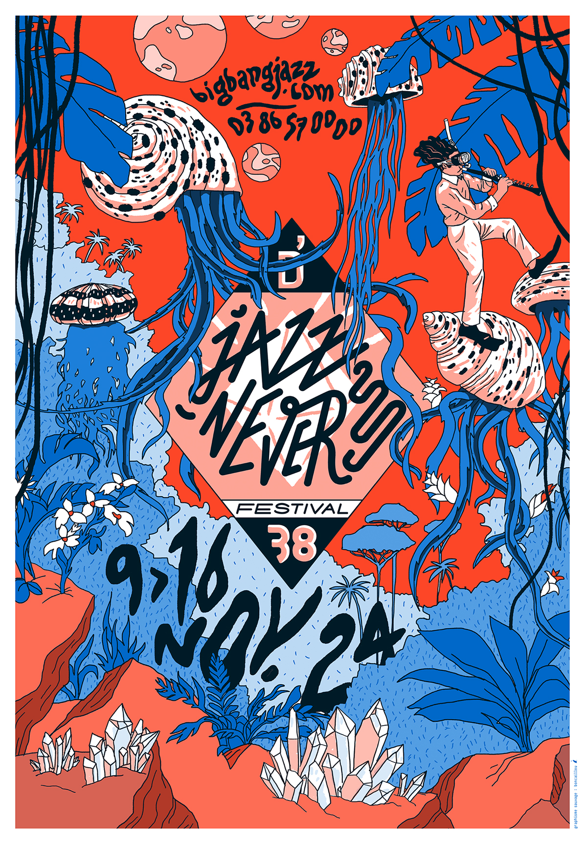 Roger Fontanel et l’équipe du D’jazz Nevers Festival ont souhaité poursuivre le travail que nous avions commencé ensemble autour de l’identité graphique du festival. Toujours avec un visuel surréaliste dessiné, en deux tons directs qui veut inclure un public large, et pas seulement des initiés.