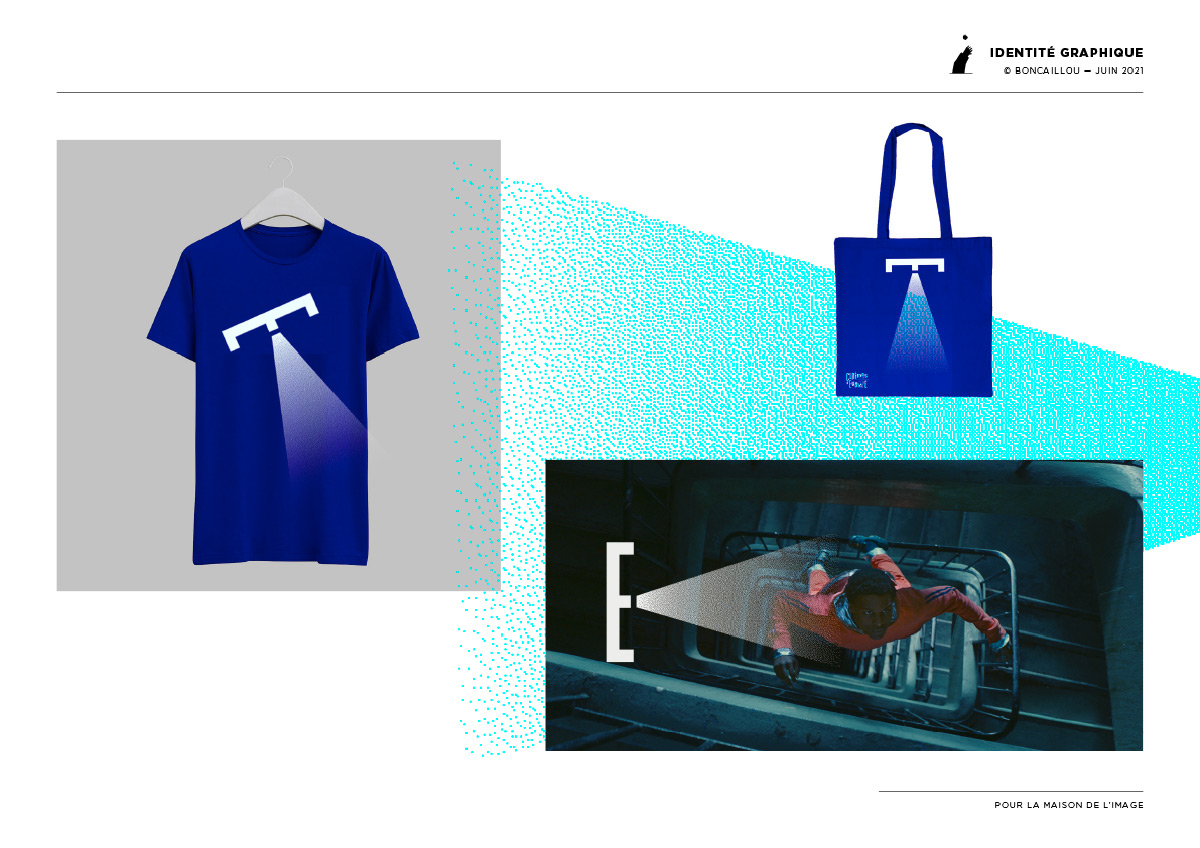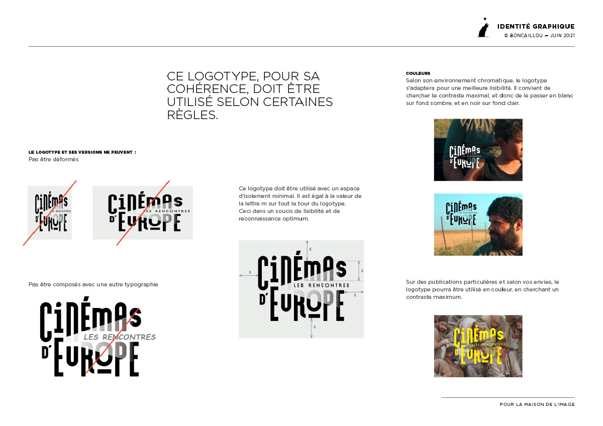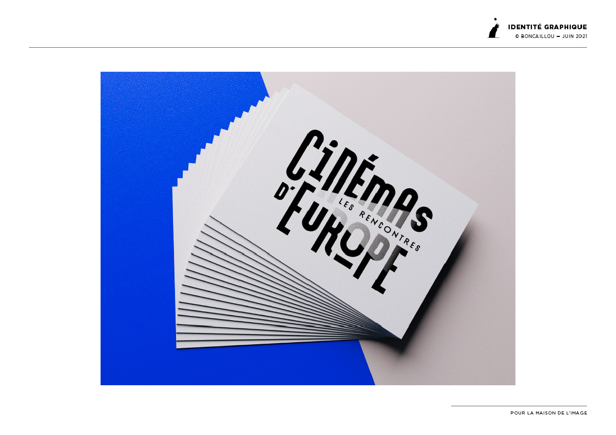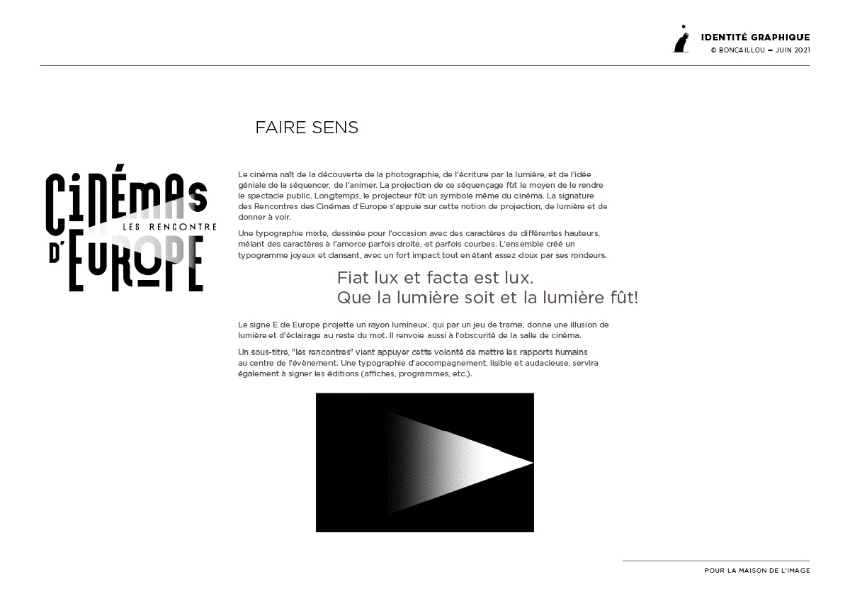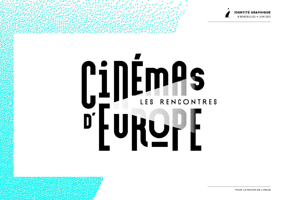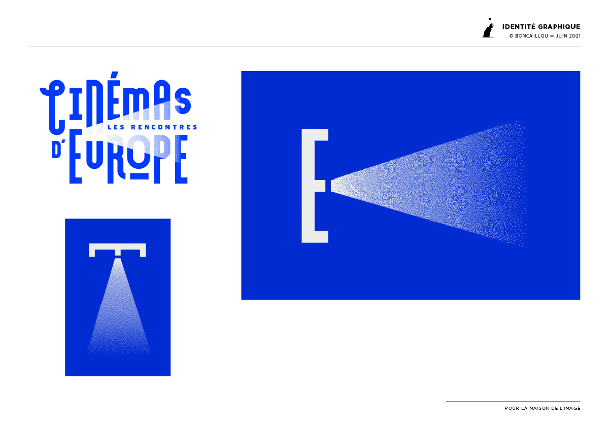 Le signe E de Europe projette un rayon lumineux, qui par un jeu de trame, donne une illusion de lumière et d’éclairage au reste du mot. Il renvoie aussi à l’obscurité de la salle de cinéma.