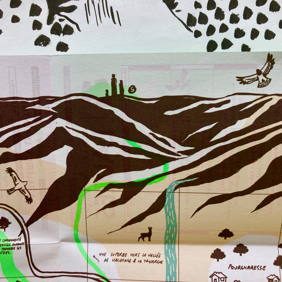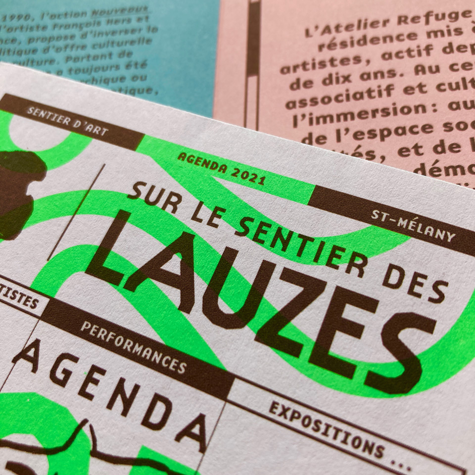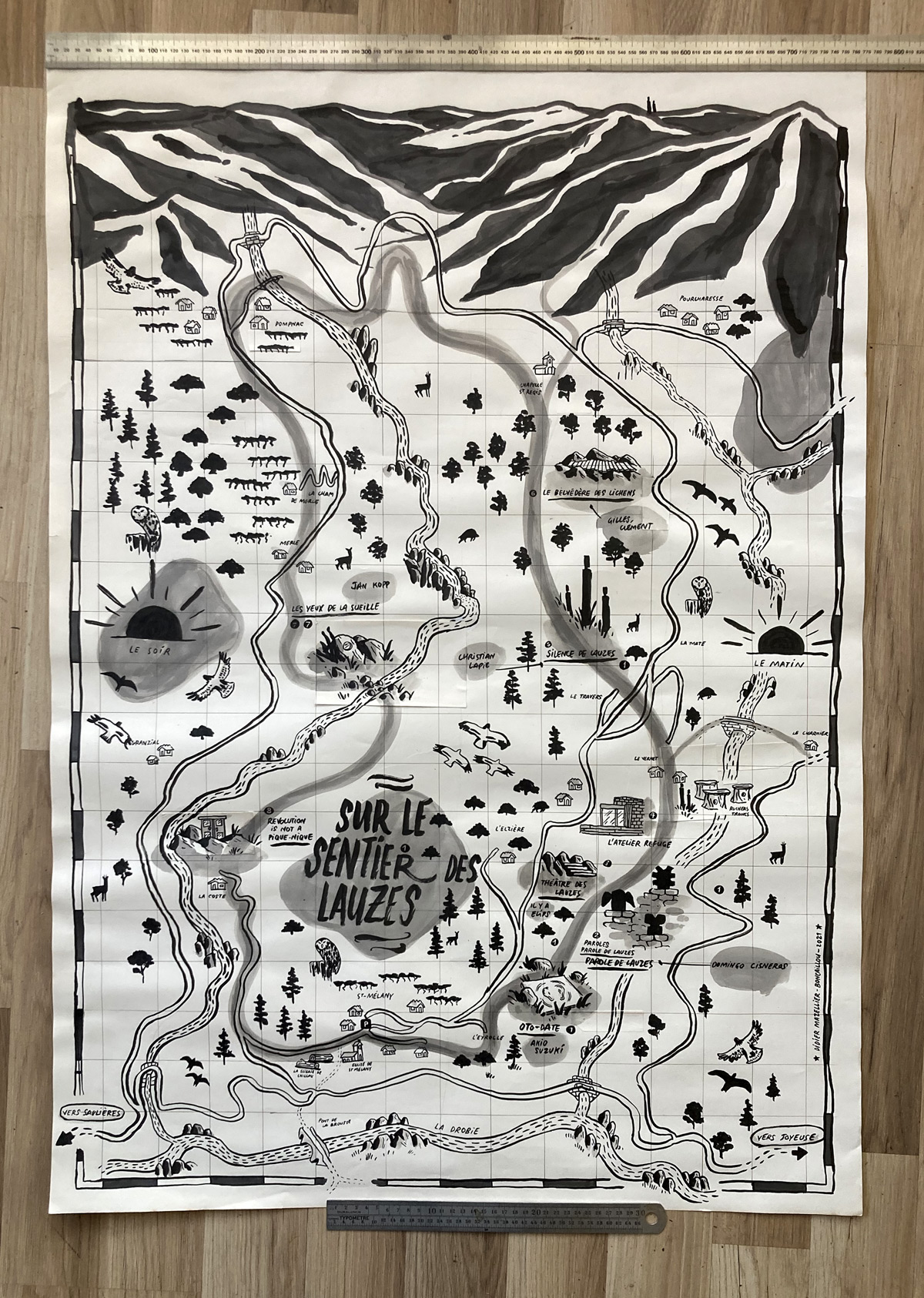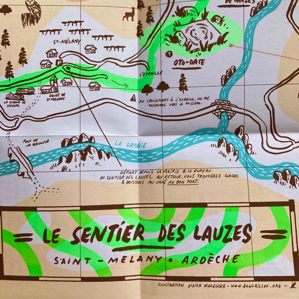 L’association Sur le Sentier des Lauzes souhaitait renouveler sa communication. Centrée autour des arts en lien avec la nature, dans sa vallée de la Drobie, avec un lieu de résidence, l’Atelier Refuge et d’un sentier de randonnées jalonnée d’œuvres de land-art, il était tout naturel d’envisager de remettre la cartographie au cœur de la communication. Un dépliant 6 volets, avec un pli croisé, pour rappeler les carte IGN, et une carte dessinée créée pour l’occasion.