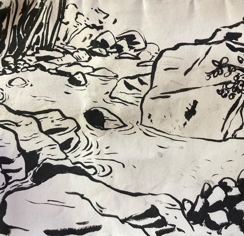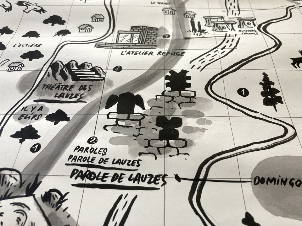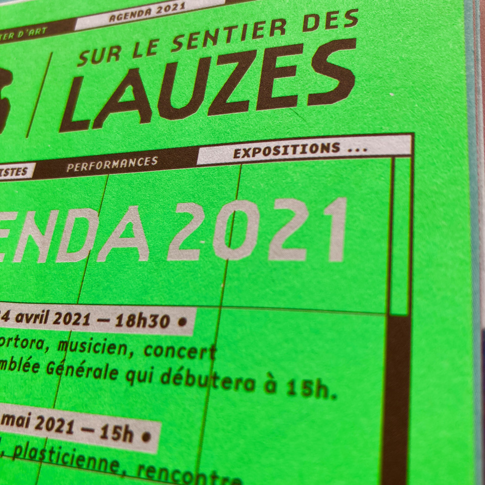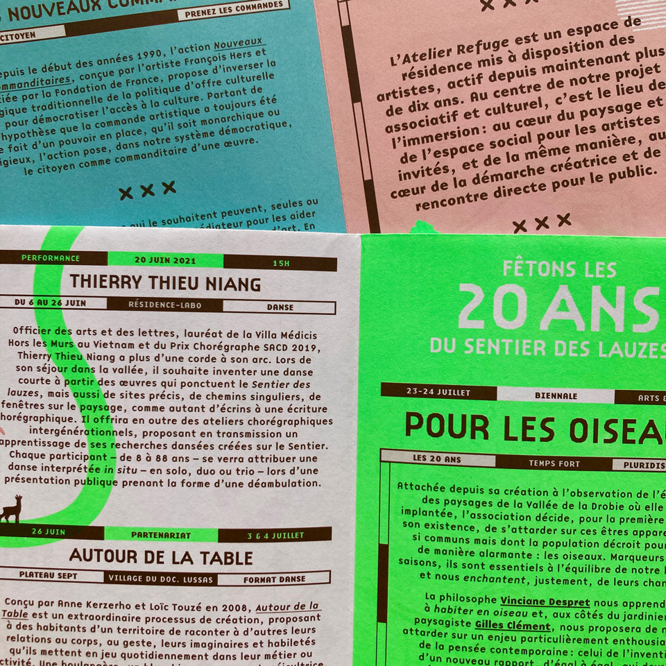 L’association Sur le Sentier des Lauzes souhaitait renouveler sa communication. Centrée autour des arts en lien avec la nature, dans sa vallée de la Drobie, avec un lieu de résidence, l’Atelier Refuge et d’un sentier de randonnées jalonnée d’œuvres de land-art, il était tout naturel d’envisager de remettre la cartographie au cœur de la communication. Un dépliant 6 volets, avec un pli croisé, pour rappeler les carte IGN, et une carte dessinée créée pour l’occasion.