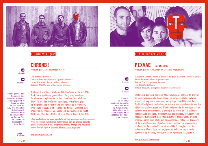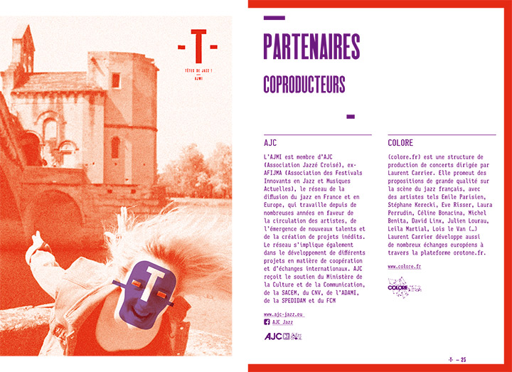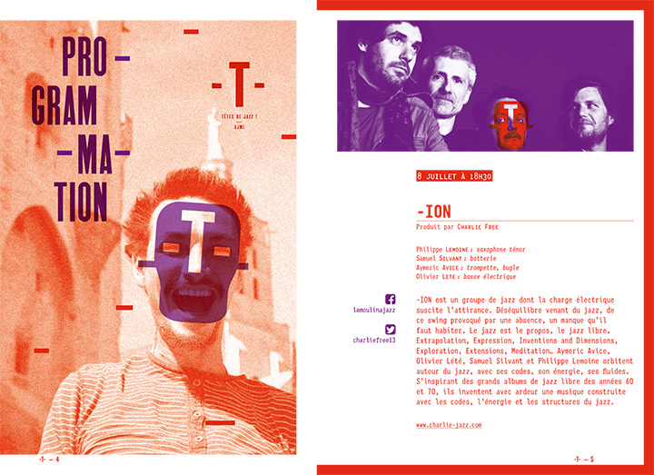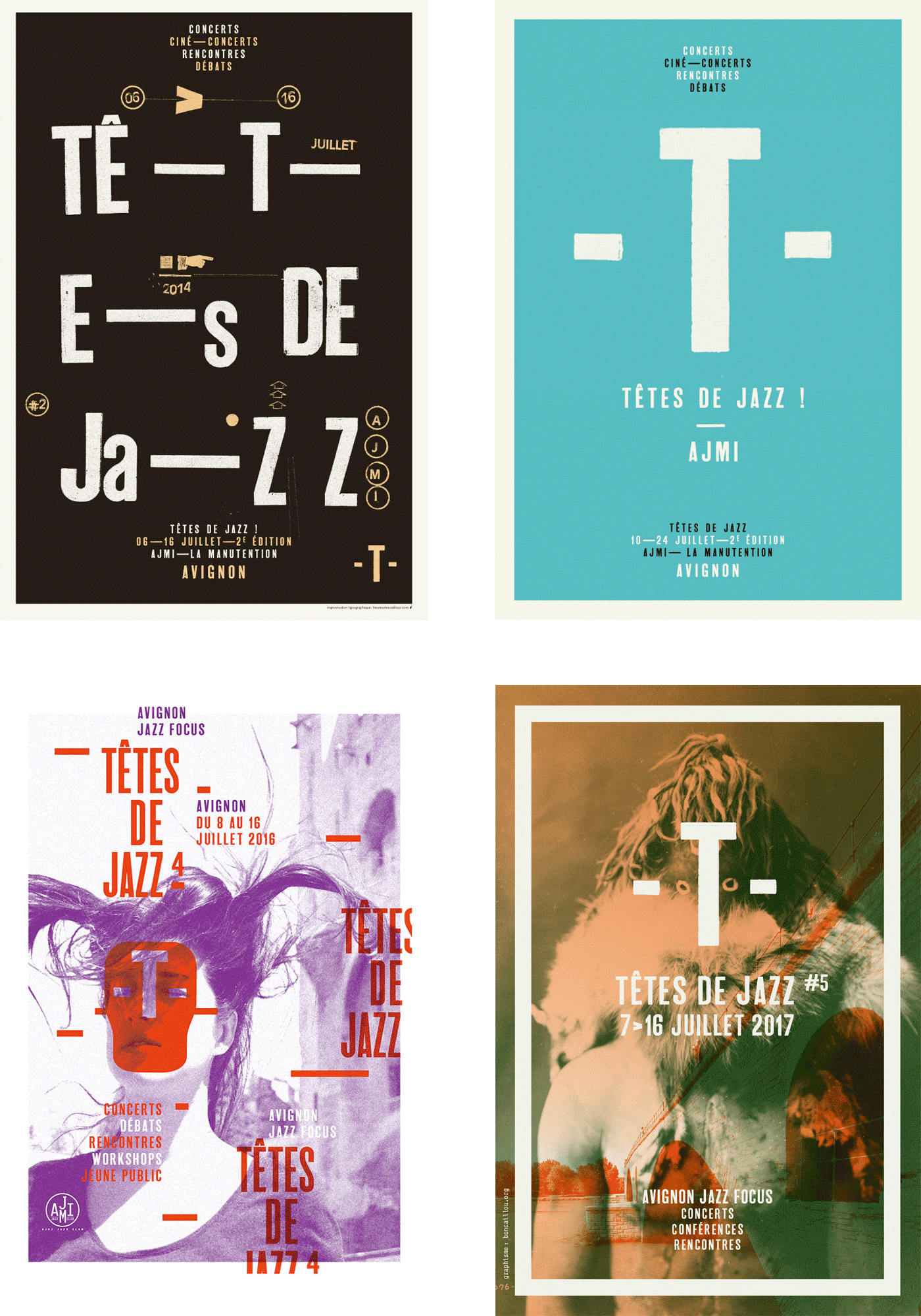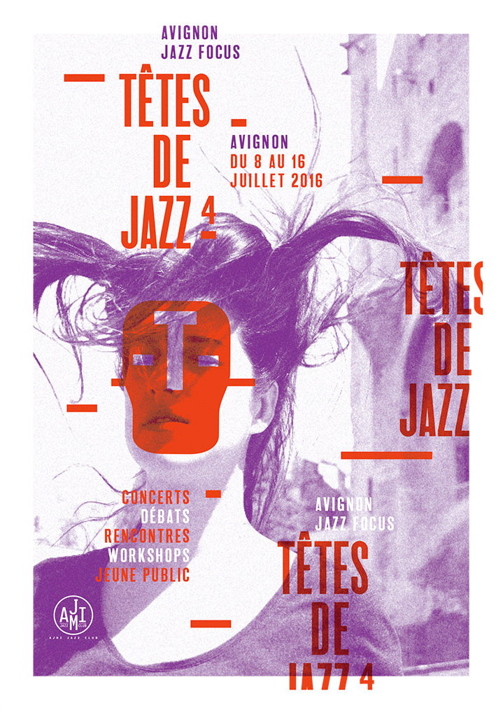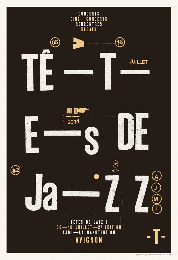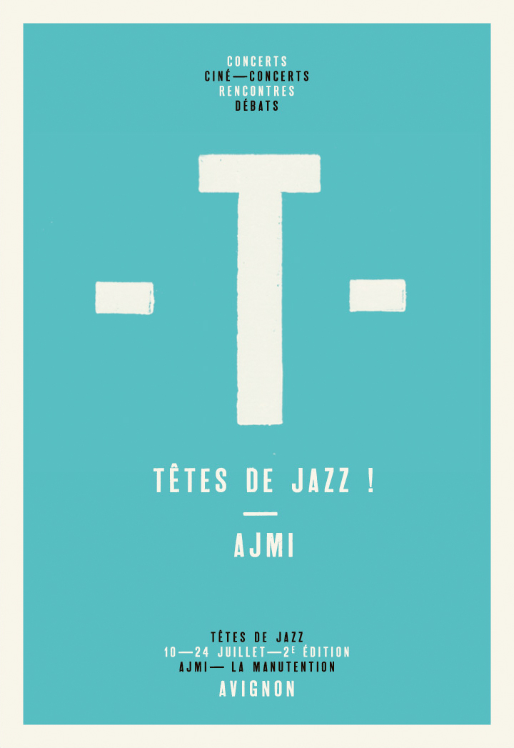 L’ AJMI (association pour le Jazz et les Musiques Improvisées), SMAC d’Avignon, nous a demandé de réfléchir à l’identité de leur festival/rencontres professionnelles Tête de Jazz 2014. Nous avons proposé de créer un signe permettant la reconnaissance du festival dans le temps. Après avoir travaillé le monogramme, nous sommes revenu sur le principe de figurer une tête, pour garder une certaine continuité, mais plus radicalement que jusqu’à présent. Le visuel de l’évènement, a été créé en typographie mobile dans un premier temps, sous forme d’improvisation, tout en ayant en tête une grille, et en insistant sur la notion de lien, de trait d’union que sont ces rencontres pro.