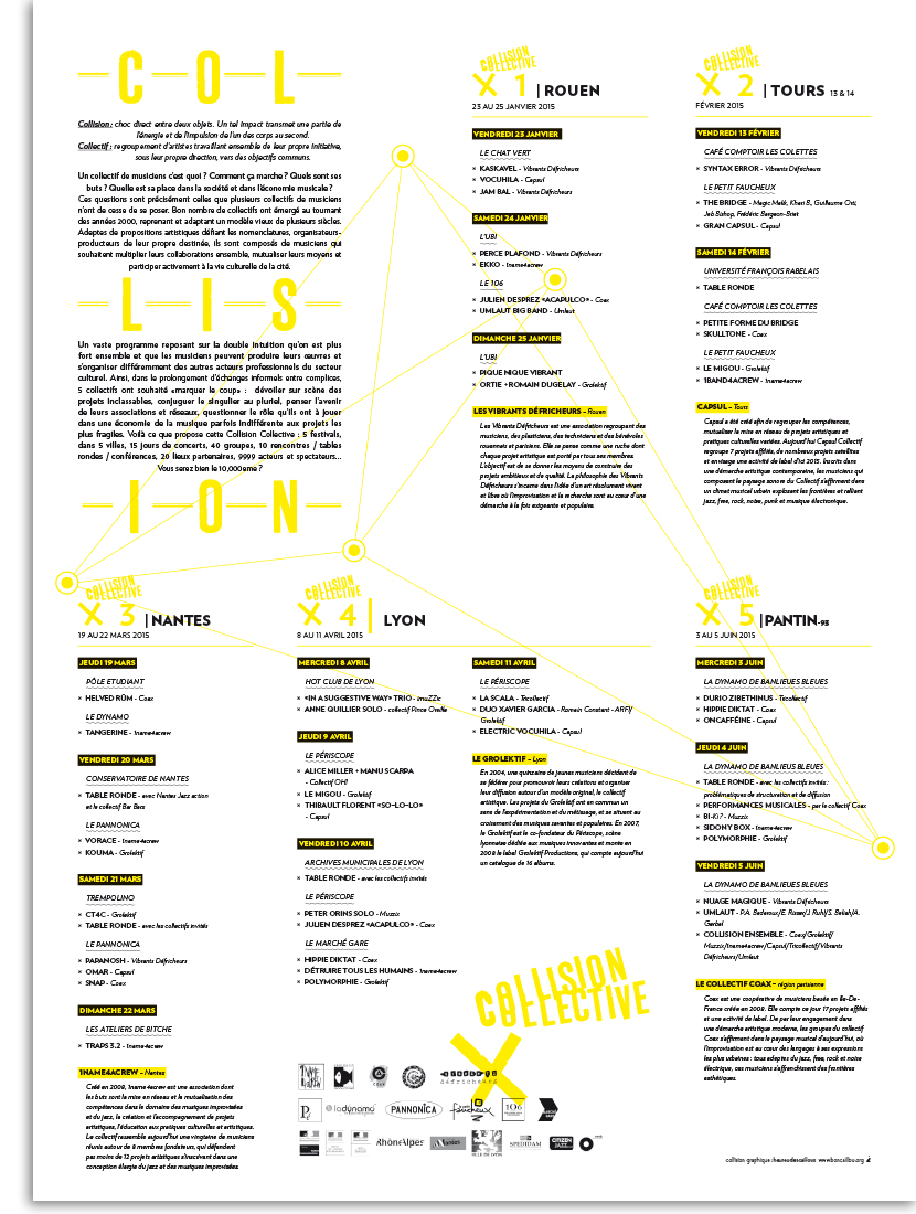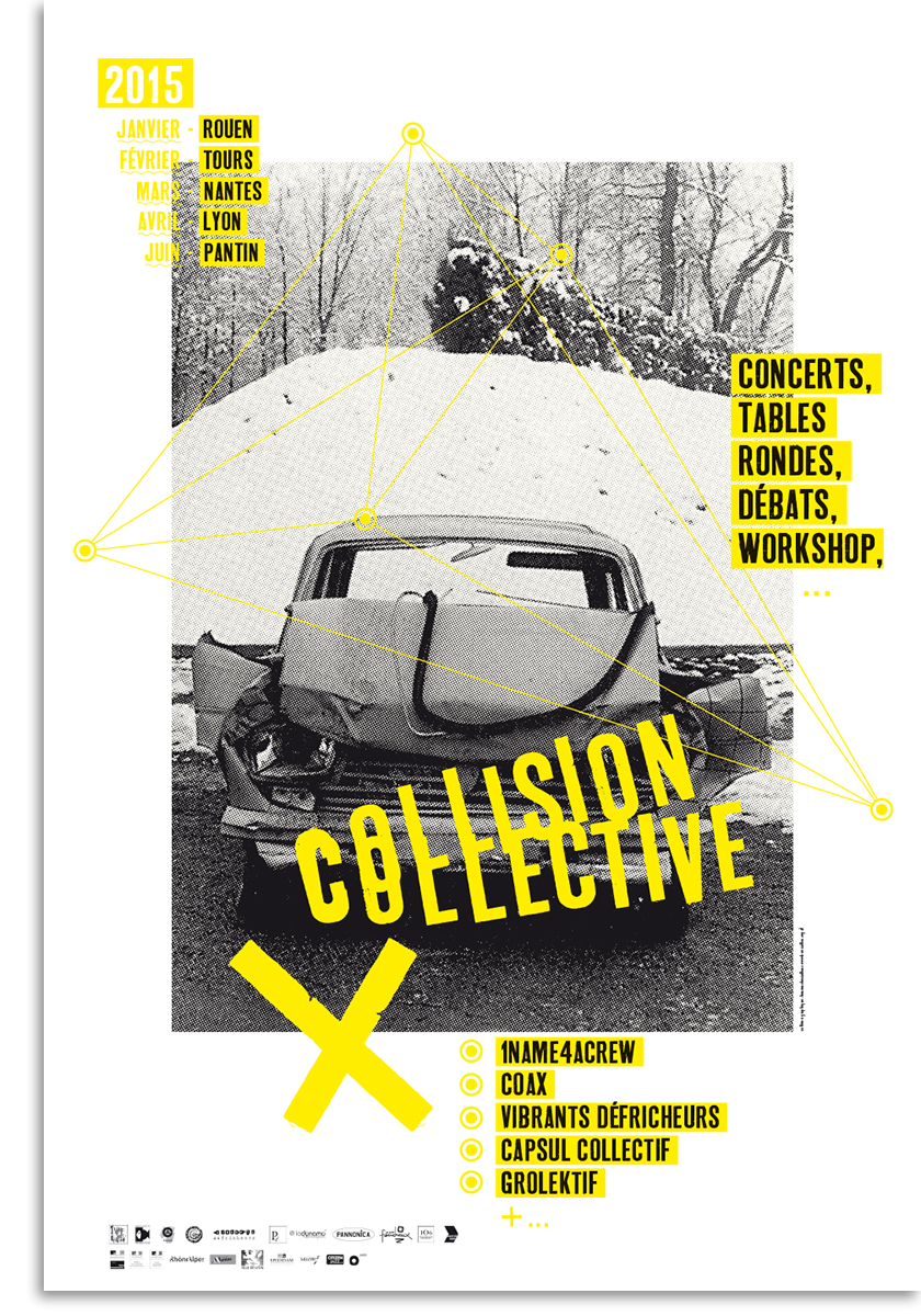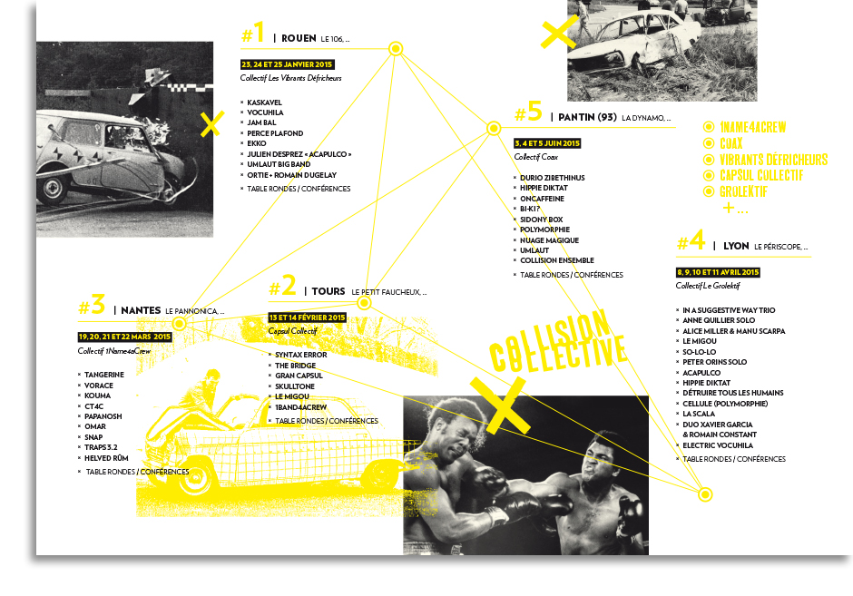 Rouen, Tours, Nantes, Lyon, région parisienne, des collectifs de musiciens se sont structurés à travers le territoire ; ils défendent une nouvelle musique, affranchie des frontières esthétiques. Jazz, musique improvisée, rock, musique traditionnelle ou contemporaine n’en sont plus que les composantes. S’opposant à une industrie musicale déclinante qui s’obstine à placer des individus sur le devant de la scène, ils revendiquent ensemble de nouveaux moyens de diffusion, réinventent le lieu de concert, organisent leur propre distribution tout en participant largement au renouveau musical actuel. Tables rondes, conférences, rencontres pluri-artistiques et une multitude de concerts avec de nombreux collectifs invités sont au programme de ce premier cycle de festivals inter-collectifs. Le mot d’ordre est donné ; partager les expériences, aller à la rencontre des publics, exprimer la force de nos régionalismes en faisant sauter les barrières... Place à la COLLISION COLLECTIVE !