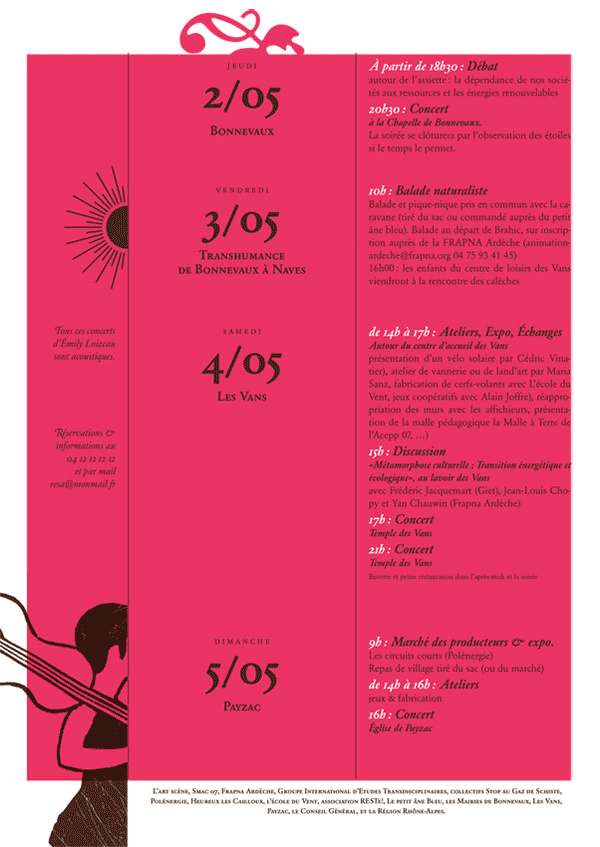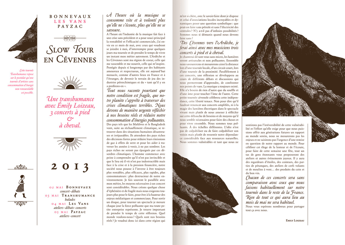 Emily Loizeau, nous a demandé de participer à son Slow tour, ode à la lenteur, mini tournée en Cévennes ardéchoises en calèche, avec un visuel en linogravure (également disponible à la vente, en série limitée, numéroté et signé, sur la boutique d’Evelyne) et une composition typographique sobre pour présenter son manifeste. Impression en 2 tons directs.
