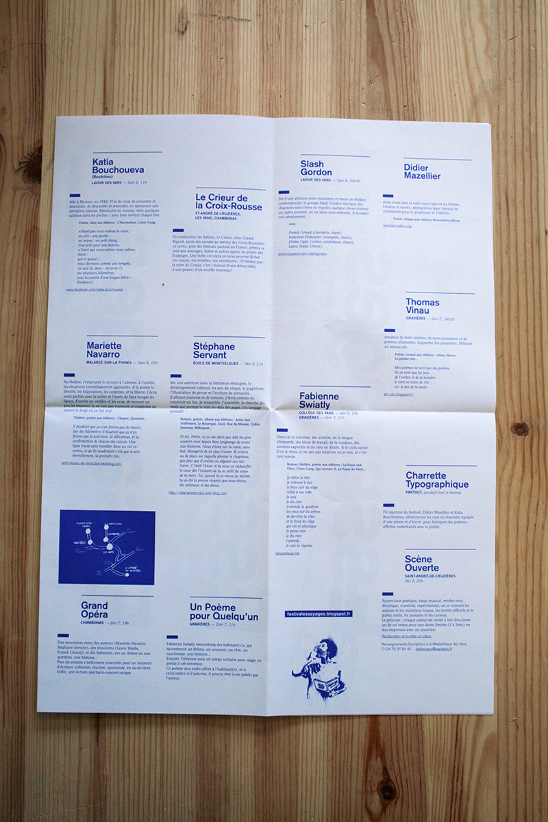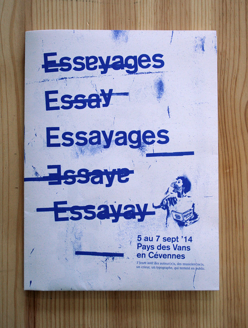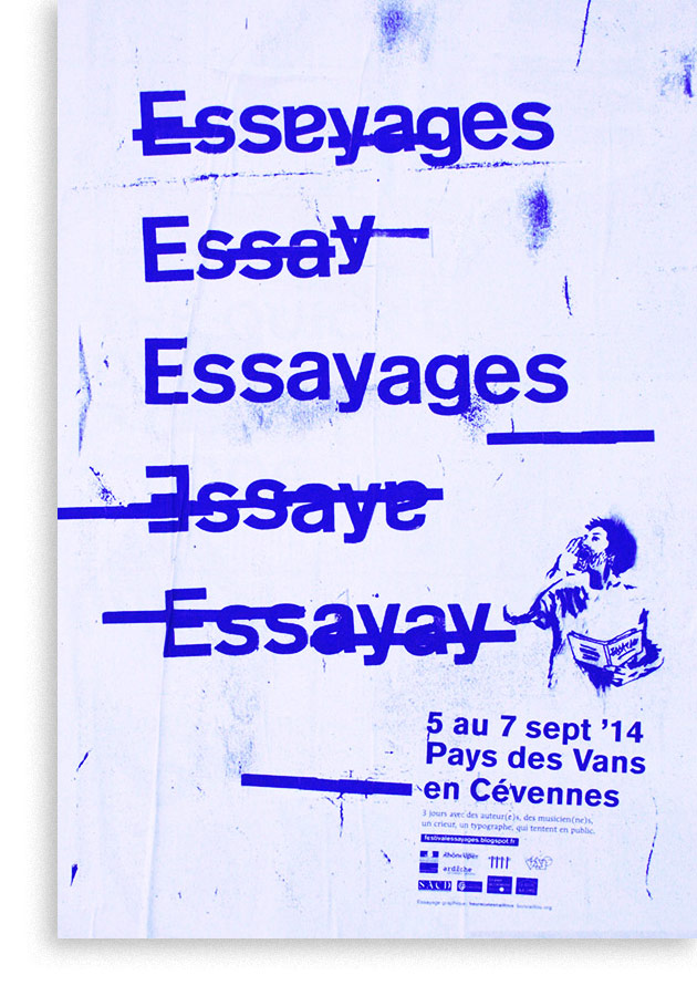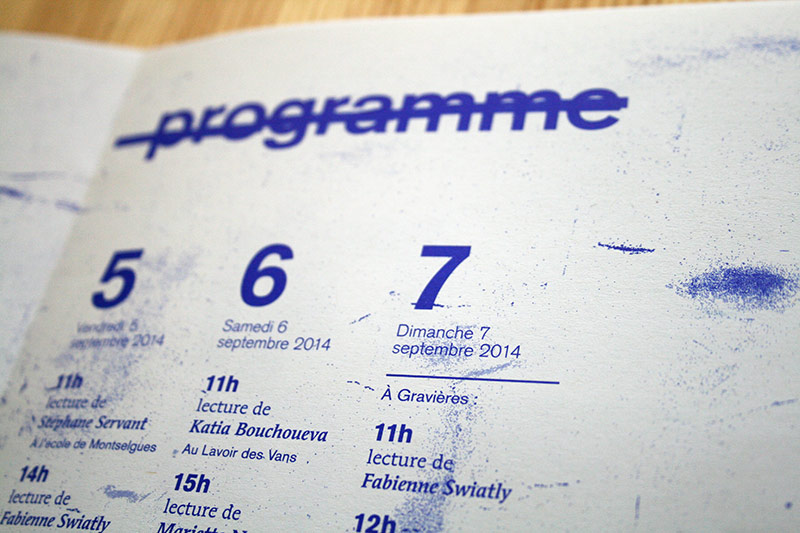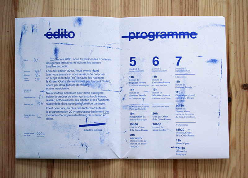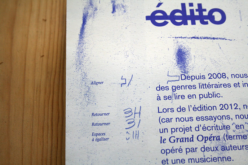 Une volonté de radicaliser l’image de ce festival pointu dans ses choix d’auteur, toujours la contrainte économique qui fait assembler programme et affiche, et de la typo de la typo de la typo (composé en plomb au préalable pour le visuel). L’édito se dote de corrections ortho-typo visibles, pour souligner le travail en cours, qui essaye…