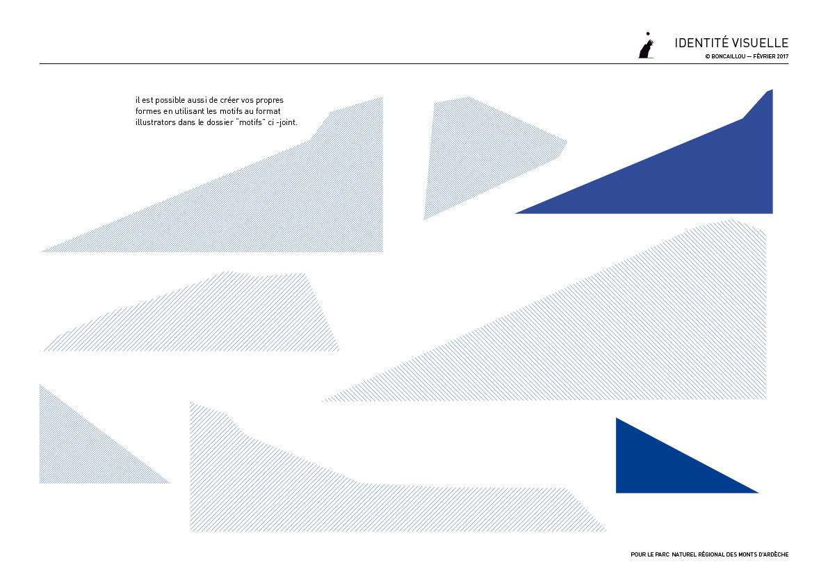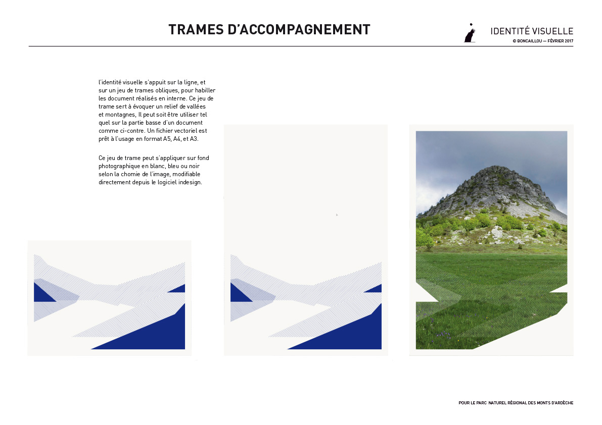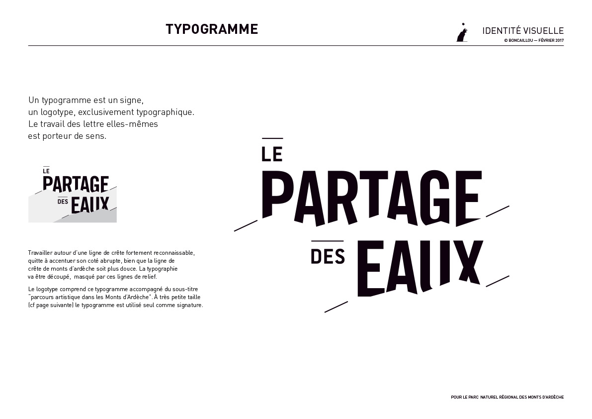 C’est à dire s’appuyer sur la représentation graphique d’un lieu, d’un terrain, par la suggestion de cette ligne de crête qui remplacera la ligne de base typographique. Elle permet d’ammener un jeu typographique simple et fin, qui induit une participation du lecteur à comprendre ce jeu, et qui a pour conséquence une meilleure reconnaissance et appropriation du logotype du projet du Partage des Eaux.L’identité visuelle combine un typogramme + une trame.