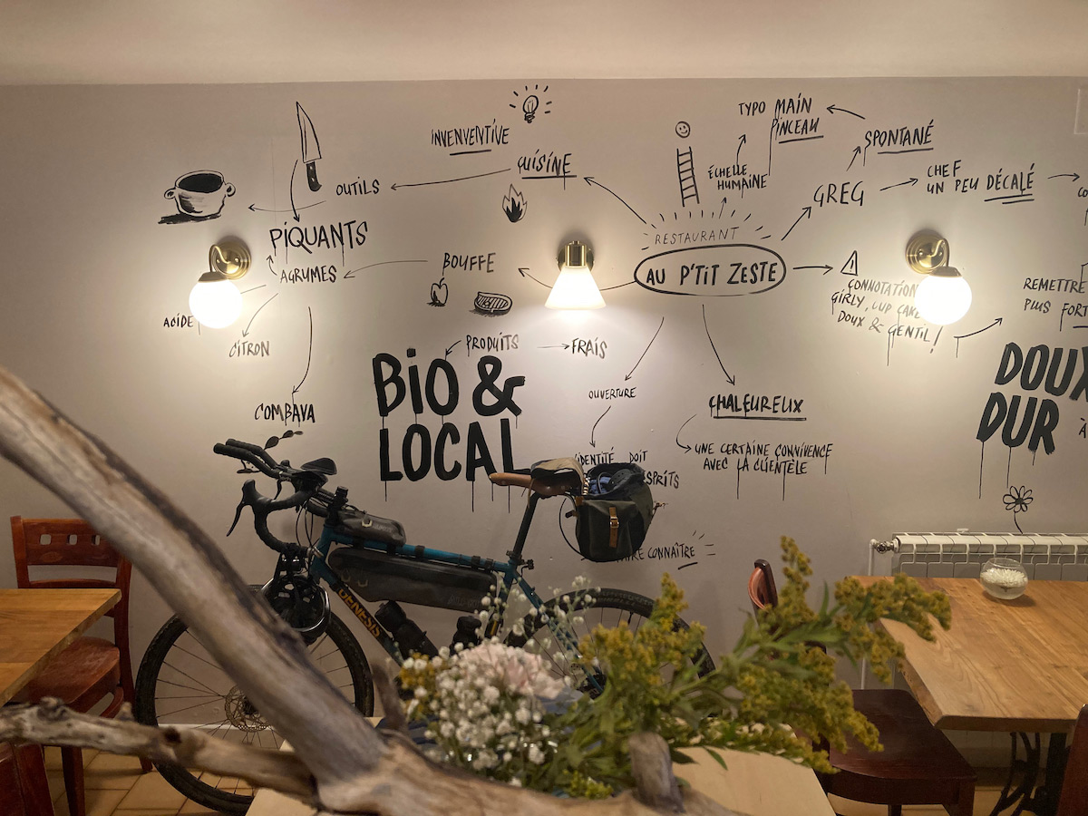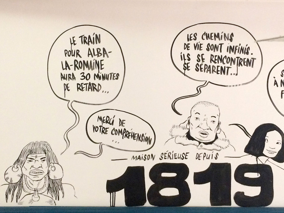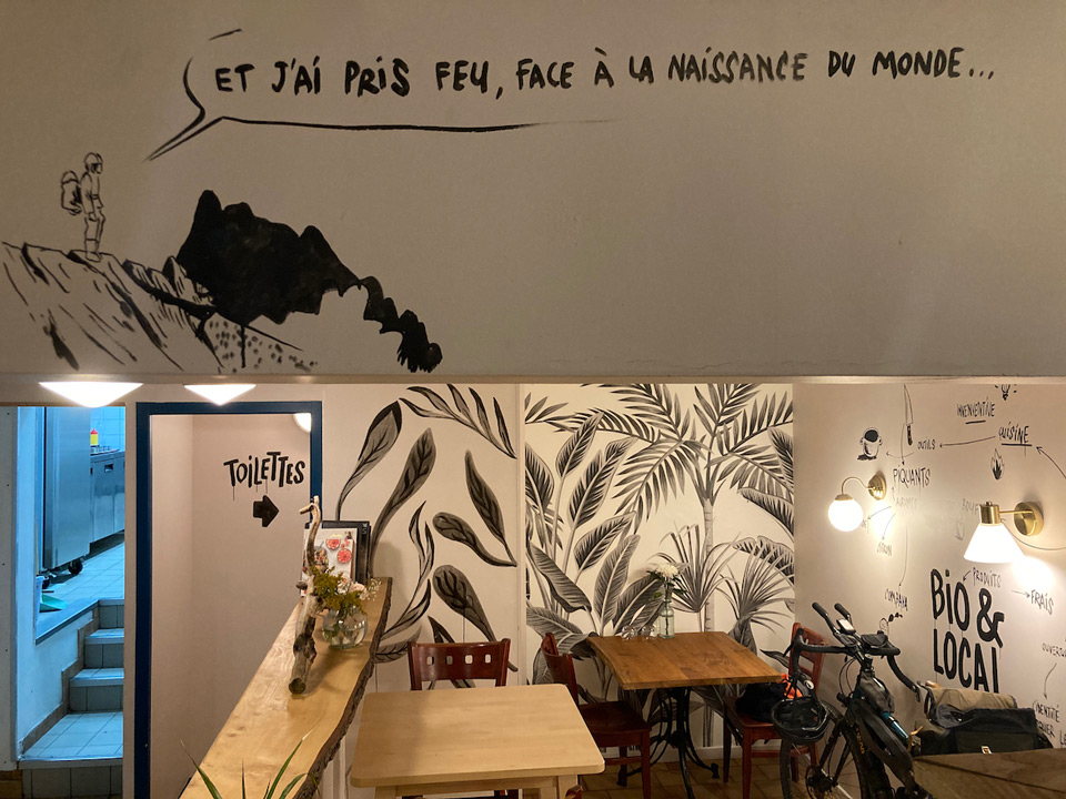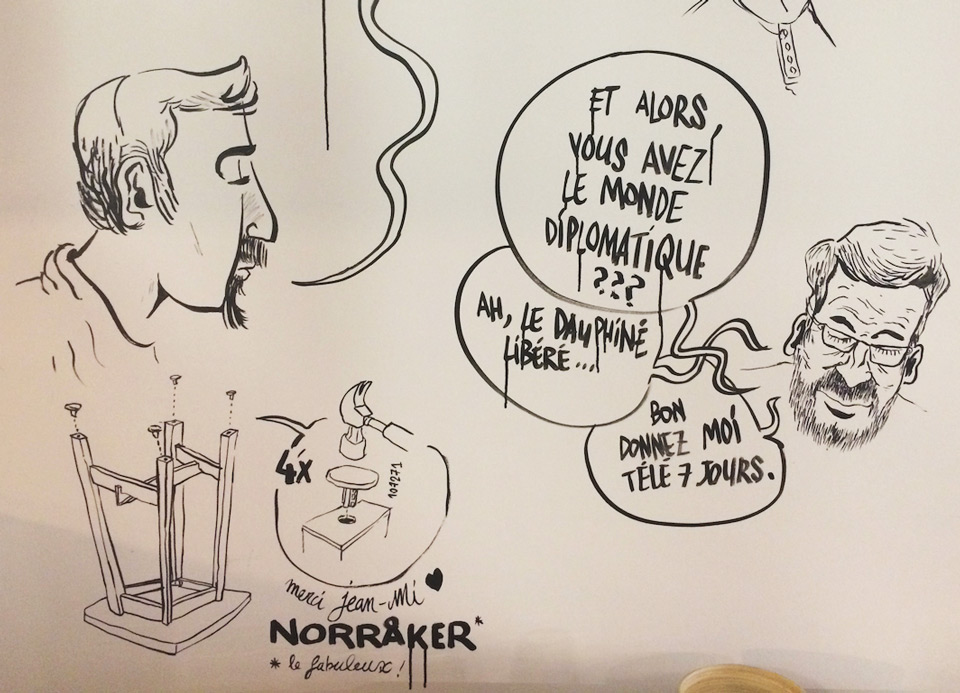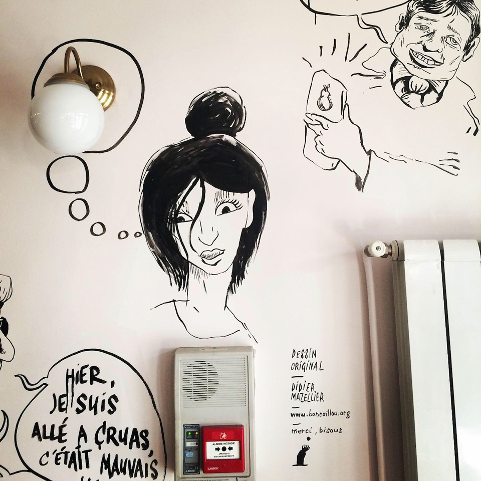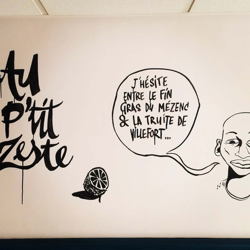 Dessins à l’encre sur les murs du restaurant, autour de la diversité culturelle et d’origine géographique, tout en s’ancrant dans cette partie de la vallée du rhône si particulière.