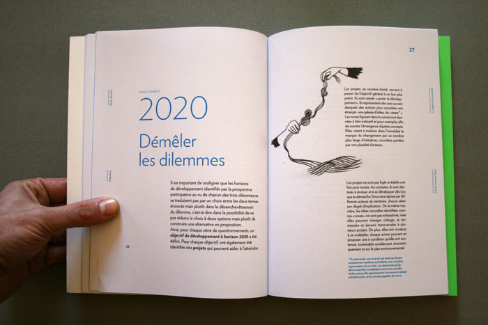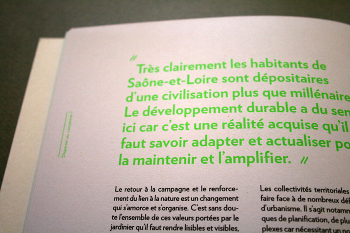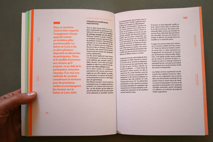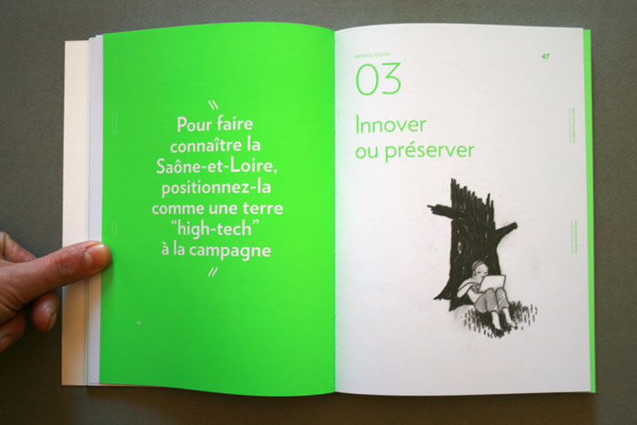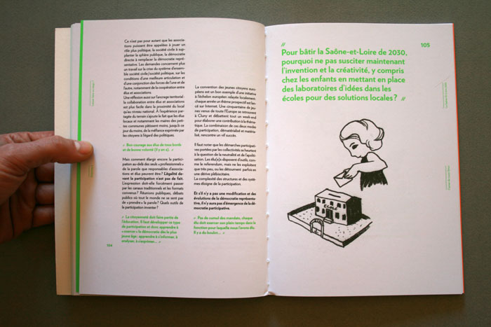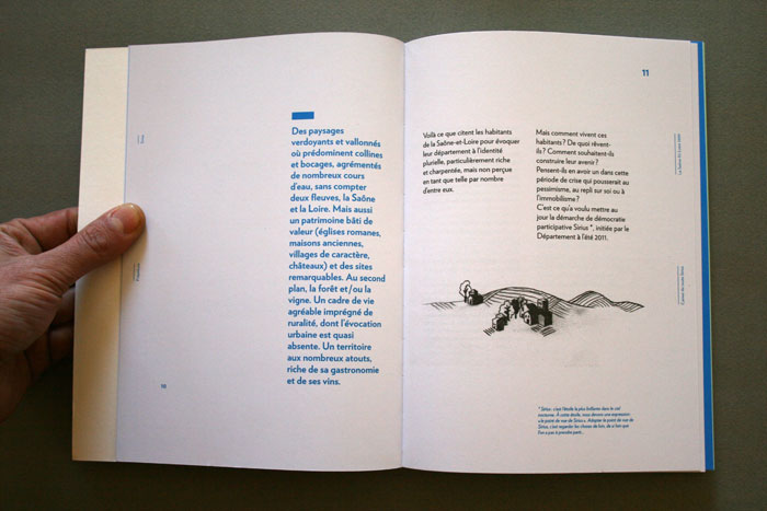 le Conseil Général de Saône-et-Loire nous a confié la conception graphique de l’ouvrage collectif Sirius 71, synthèse de 2 ans de consultation et de démocratie participative. Les contraintes d’impression ont permis de réfléchir un ouvrage composé de cahier en 2 tons directs, permettant de mettre en avant les phrases d’habitants. Dans une volonté de projection du lecteur, nous n’avons pas utilisé de photographie, mais uniquement des illustrations crayonnées d’Evelyne Mary. Nous voulions un ouvrage sobre, facile d’accès et parlant à tous les habitant, tout en restant exigent, et en véhiculant une neutralité n’excluant personne. L’empagement et les marges de pied et de tête varient selon la partie de l’ouvrage, et sa projection dans le temps. Les textes sont tous composés en Verlag, sauf certains titres crées pour l’occasion.