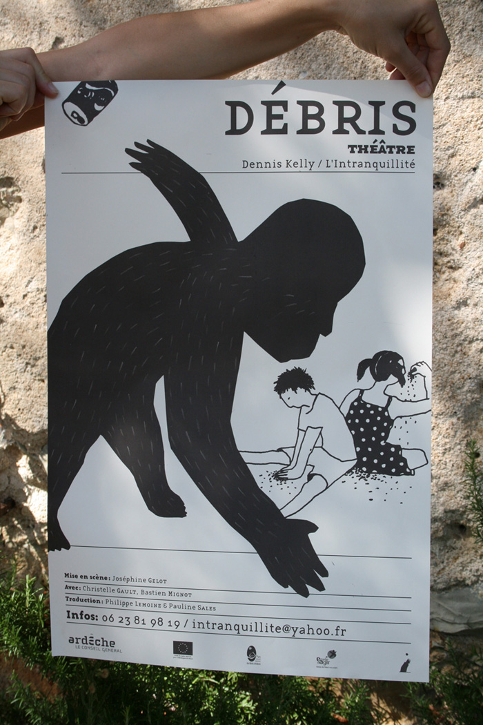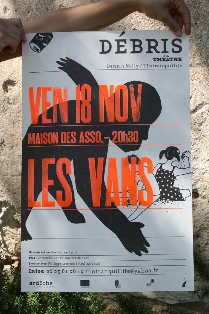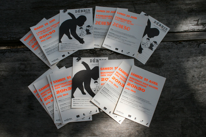 Communication de la Compagnie L’intranquilité pour la pièce Débris de Dennis Kelly. Impression offset 1 couleur + superposition typographique en FLUO à l’atelier pour adapter à la date et au lieu.