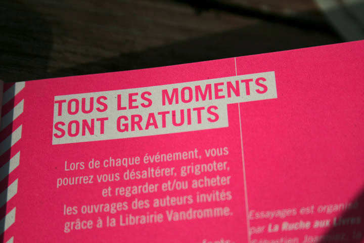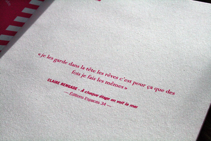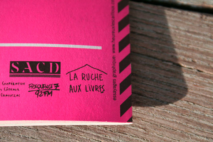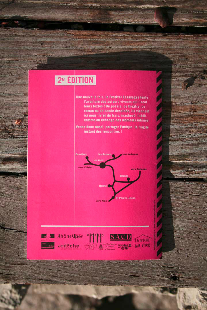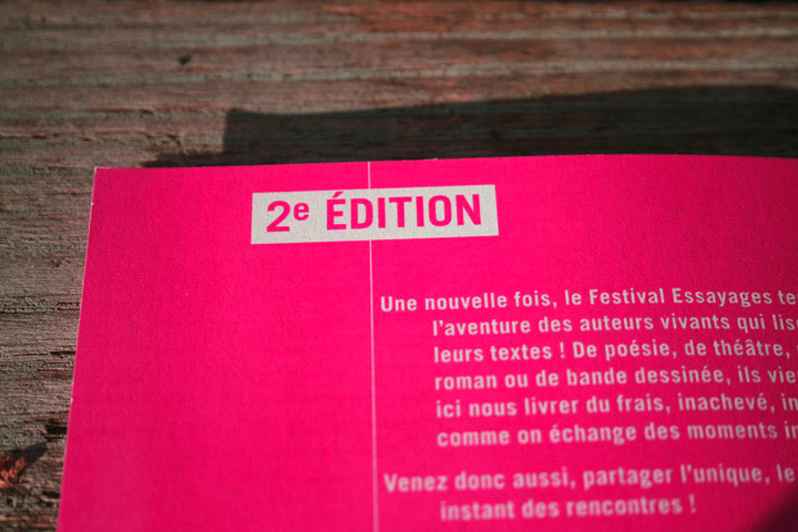 le festival de lecture contemporaine, organisé par la ruche aux livres et chapeauté par Sebastien Joanniez, àlieu tous les deux ans. La communication s’appuie sur deux couleurs, en tons directs. Le visuel est réalisé en linogravure, avec la technique de la plaque perdue.