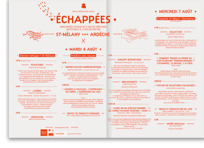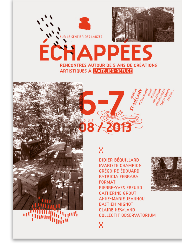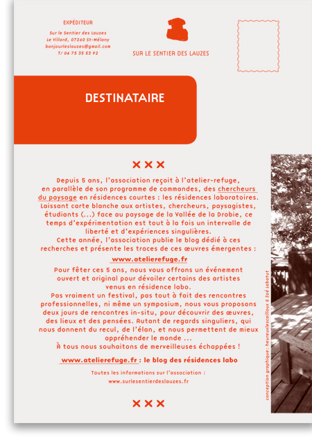 dépliant/affiche pour les copains du Sentier des Lauzes, et pour fêter les 5 ans de création à L’atelier Refuge, résidences d’artistes interrogeant le territoire, dans la vallée de la Drobie.