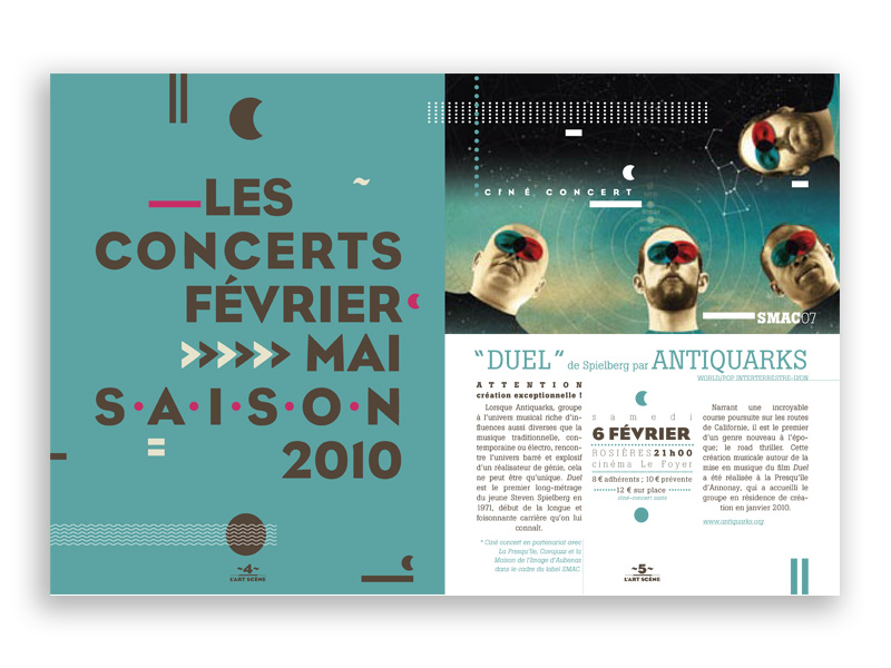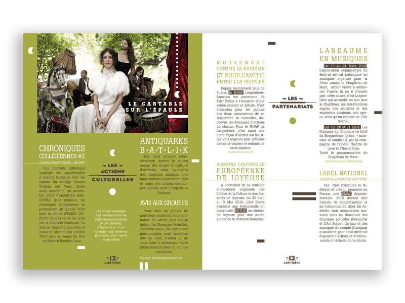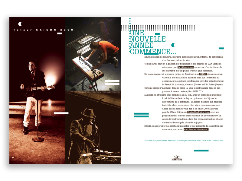 l’association l’art scène, organisatrice du festival de la pleine lune à payzac, nous renouvelle sa confiance pour cette nouvelle saison. Le rapprochement de deux autres structures ardéchoises de diffusion musicale les a amené à vouloir mettre en avant le coté "ardéchois" de l’association. Une réponse décalée, reprenant des stéréotypes départementaux, le sanglier, le chien de chasse et la truite . ... . .... .. .
